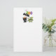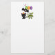 Papel de carta com um morcego voador preto, um morcego múmico verde vestindo bandagens brancas e um gato preto bonito com um chapéu de bruxa laranja. Boo escreveu em letras coloridas divertidas com um fantasma feliz flutuando para trás.