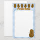 Batata de desenho marrom, branca, com uma adorável face feliz, se posiciona no canto inferior direito e, na parte superior do papel, uma linha de batatas engraçadas. O fundo é um padrão clássico de cheques azuis e brancos, gingham. Um modelo que lê Notas de Batata em letras laranja abaixo da linha de batatas no topo da página é um modelo que pode ser usado como está ou alterado para seu próprio nome ou texto.