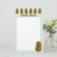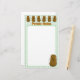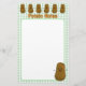 Batata de desenho marrom, branca, com uma adorável face feliz, se posiciona no canto inferior direito e, na parte superior do papel, uma linha de batatas engraçadas. O fundo é um padrão clássico de cheques verdes e brancos, gingham. Um modelo que lê Notas de Batata em letras laranja abaixo da linha de batatas no topo da página é um modelo que pode ser usado como está ou alterado para seu próprio nome ou texto.