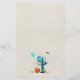 Papel de carta com uma cena legal assustadora de halloween. Um fantasma azul gelado flutua no ar. Uma velha árvore morto tem uma coruja sentada em seus galhos e um morcego pendurado de cabeça para baixo. Uma mão está ascensão de uma sepultura antiga. Os morcegos estão voando ao redor de um cheio luando. Alguns doces estão cheios de uma abóbora de dentro de brim com milho doce espalhado. Um crânio paira no ar.
