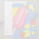 Papel de papelaria com tema de verão. Projetado com picolé cor-de-rosa e alguns morangos vermelhos caindo ao redor do picolé juntamente com alguns plasmas de tinta amarela. Fundo azul. Uma camada branca semitransparente colocada sobre o topo para que você possa gravar no topo.