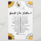 Este é um Jogo de Chá de Bebê 'Bumble Bee Honey Bee Would She Rather?'. *Would She Rather? - A futura mamãe preencherá sua própria folha de respostas. Os convidados circularão a opção correta com base em seu conhecimento pessoal sobre a futura mamãe. Quem acertar mais respostas, ganha!