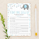 Este é um elefante azul chamado Find The Guest Chá de fraldas Game. *Find The Guest - Este é um jogo de quebra-gelo. O jogo inclui 15 perguntas. Cada convidado irá ao redor do chá para encontrar outros hóspedes, encontrar pessoas que combinem com cada pergunta, e depois preencher seus nomes. Quem tem mais nomes preenchidos, ganha! O design é composto por um elefante azul e cinza com bolinhas. Jogos de chá de fraldas, caça-quebra-gelo, animais de jardim zoológico, animais de jardim zoológico, elefantes, animais de safari, atividade do chá, atividades do chá, chá de fraldas de menino