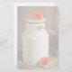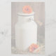Papel de papelaria com tema rústico. Fotografia de uma jarra de leite branca e um casal de flores laranja colocadas em volta da lata de leite. Sentado num celeiro com feno. Painéis de madeira no fundo.