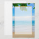 Papel de carta com fotografia de uma praia tropical. Areia quente, água azul e azul com folhas tropicais ao longo do topo. A camada sobre o topo é uma camada semitransparente com uma borda dourada para um escrevendo facilmente legível.