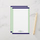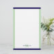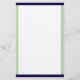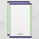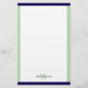 Papel de papelaria personalizado com bordas limpas em azul escuro e verde-celadão com o seu nome na mesma cor azul no seu início no mesmo verde-claro. Papel de carta azul e verde personalizado com seu nome e inicial. Papel de papelaria monograma para ele com uma borda moderna de blocos coloridos em azul escuro e verde claro, impresso com seu nome e inicial no fundo.