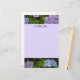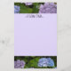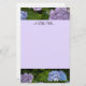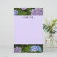 Um bonito design com um cabeçalho e rodapé com flores de pirâmide e de hydrangea azuis cercadas por folhagem verde. Um fundo macio e uma mensagem que diz "Um pequeno alô..."