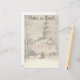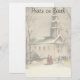 Ilustração antiga vitoriana de Natal com tema religioso apresentando uma igreja em uma paisagem invernal com árvores. Há neve no chão e paroquianos estão chegando para os cultos. Belos tons antigos com cores vibrantes de vermelho e verde nas janelas.