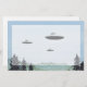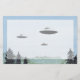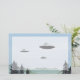 Uma aquarela, caneta e tinta, e desenho a cores de lápis de três OVNIs de disco sobre as montanhas.