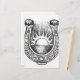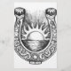 Ilustração de estilo tatuagem de ferradura embelezada e decorativa com sol brilhante e mar no meio em fundo isolado.