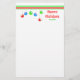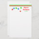 Papel de carta para os feriados com o meu design de Enfeites de natal bonito, vermelhos, azuis e verdes pendurados em faixas verdes e vermelhas.