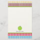 Artigos de papelaria que caracterizam uma beira de bolinhas coloridos em vários tamanhos na parte superior e na parte inferior com guarnição verde. Ilustração de uma maçã verde no fundo. Personalize com seu nome sob a maçã.