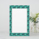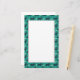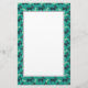Papel de carta desenhado com um padrão repetitivo que apresenta um cachorro sorridente e bonito com orelhas de disquete e um osso de cão. Fundo verde. Um quadro branco com uma borda preta colocada sobre cima para gravar.