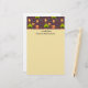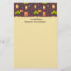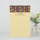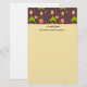 Papel de carta com um padrão na borda superior e seu nome personalizado. Projetado com um padrão temático divertido de acampar. Colocado sobre um fundo castanho avermelhado. Elementos no padrão incluem uma fogueira, uma tenda, uma guitarra, uma pá e mochila.