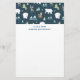 Papel de papelaria com um padrão festivo caprichoso. Ursos polares, renas, árvores, raposas e flocos de neve. Num fundo verde escuro.