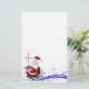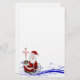 Papai Noel e seu trenó no Polo Norte com bonito neve azul florescem no fundo desta papelaria de Natal.