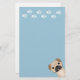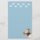 Papel de carta feliz brilhante simples que caracteriza uma linha dos pawprints brancos ao longo do pug superior e bonito que espreita do canto direito inferior.