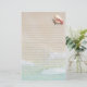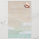 Papel de carta forrado com fundo de areia de praia e concha rosa. Papelaria bonita com tema de praia para escrever notas pessoais à mão para qualquer pessoa. Ambos os lados são decorados com imagem de areia e ondas contendo água azul turquesa tropical. As ondas estão subindo do fundo na frente e descendo do topo no verso. Uma imagem de concha rainha fica no topo e as linhas são cinza claro.