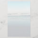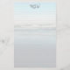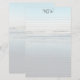 Papel de escrita pessoal monogramado e pautado. Um fundo de cena de praia leve tem ondas a entrar na praia na maré baixa. Linhas leves cobrem o papel na frente com um modelo para três iniciais monogramadas no topo. O verso do papel também tem a cena da praia.