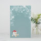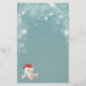 Um papel de carta de natal festivo. O design tem flocos de neve brilhantes, luzes e floresce. O fundo é um azul esverdeado. A parte inferior da página tem uma ilustração de um belo e pequeno yeti de Natal, boneca de brinquedo, vestindo um chapéu de Papai Noel vermelho. O pequeno yeti tem uma corda de tração para fazê-lo falar e ele está coberto de pele branca macia com sotaques castanhos-claros.