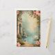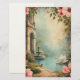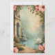 Um design de papelaria que parece entrar num sonho. A cena abre para um pátio barroco ornamentado, enquadrado por arcadas de pedra esculpida e floreios arquitetônicos delicados que evocam jardins europeus centenários. No centro, uma fonte de água graciosa brilha com um brilho suave e nacarado, suas cascatas suaves adicionando um sentido de serenidade e movimento.
