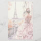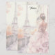 Mulher em pé perto de uma janela olhando para a Torre Eiffel. Nome personalizável. Papelaria.