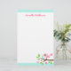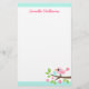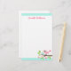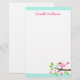 Papel de papelaria bonito com um passarinho rosa com um ovo sentado num galho com folhas verdes e flores cor-de-rosa. No topo e no fundo estão as bordas aqua azuis. Texto personalizável, adicionar um nome ou outro texto. design doce e divertido.