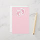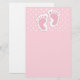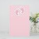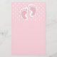 Papel de papelaria com uma imagem adorável de pegadas cor-de-rosa de menina com um contorno branco pesado. Bolinhas brancas sobre um fundo rosa atrás da ilustração.
