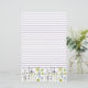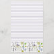 Papel de papelaria revestido, de boa natureza, decorado com desenhos botânicos de flores silvestres roxas e amarelas, penas azuis e um pequeno sapo desenhado em caneta preta e tinta com aquarela.