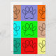 Um padrão fofo de pata preta de cachorro imprime em quadrados de diferentes cores. Design de decoração original.