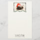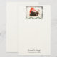 Papel de carta com uma fotografia adorável de um filhote de cachorro dormindo enquanto veste um chapéu de santa. Feliz Natal está escrito na banda de seu chapéu, com uma letra manuscrita na moda. Uma borda cinza com luzes coloridas de Natal cercando a moldura dessa foto fofinha. A parte inferior deste item tem texto personalizado que diz: Love & Pugs com nome de yout.