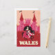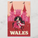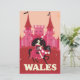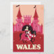 Belo estilo de vintage poster de viagens galês de cavaleiro em um cavalo e um castelo velho.