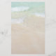 Papel de carta alinhado com areia de praia e concha rosa. Bonito papelaria de praia para notas pessoais escrevendo de mão para qualquer um. Ambas as faces são decoradas com areia e imagem de surf contendo água azul turquesa tropical. As ondas estão vindo de baixo na frente e para baixo do topo na parte de trás. Uma imagem da casca do concha rainha fica no topo e as linhas são cinzas de luz.