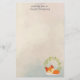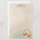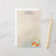 Papel de papelaria personalizado com um fundo colorido de cor creme de cor verde com formas geométricas esmaecidas de tendência. Camadas sobre o topo é um desenho animado de uma raposa de laranja fofa que dorme pacificamente. Uma coroa verde de folhas atrás.
