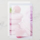 Papel de carta com uma fotografia deliciosa que inclui uma torre de macarões cor-de-rosa com framboesas colocadas à volta. Deliciosamente divino.