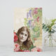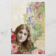 Este belo design vitoriano mostra o rosto de uma mulher dando palmadinhas em frente a um fundo de aquarela com uma porta frontal e degraus e flor colorida ao redor. A mulher também tem rosas vermelhas e cor-de-rosa.