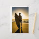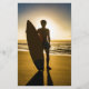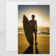 Um surfista parado na praia, com a prancha de surfe na mão, em frente ao oceano, silenciado contra o sol da ascensão.