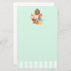 Papel de carta ilustrado com uma tigela de sorvete com 3 deliciosas colheres cobertas de doces. Um cone de sorvete também com 3 colheres de chocolate, baunilha e morango. Uma tigela de sobremesa cheia de sorvete com sabor neopolita com uma cereja deliciosa no topo. Um padrão de listras verdes e brancas no fundo.