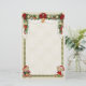Esmague Garland e tropeçou Drapes com dois bonitinhos ursos de Natal vestidos em suas fantasias de férias. Ursinho está embrulhando um presente e ursinho está segurando um biscoito de pão de gengibre. Fundo ligeiramente texturizado.