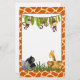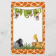 Papel de papelaria com tema legal safari. O fundo é um padrão de pele de girafa. Projetado com uma faixa de folhas da selva no topo e macacos maliciosos pendurados de cabeça para baixo. Um hipopótamo, gorila, leão e girafa pendurados no fundo em algumas gramíneas de savana. .