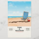 Tome uma Férias " É mais rápido por caminho de ferro" poster de férias de praia, estilo Vintage, de uma cadeira de baralho listrada vintage e de uma bola de praia numa praia arenosa perto do oceano.