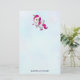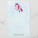 Papel de papelaria com um unicórnio alado branco com mané rosa, cauda e cascos. A buzina tem anéis de cor arco-íris e parece um pirulito doce. Este unicórnio fofo está se erguendo nas pernas traseiras. Doce cor-de-rosa na bochecha e longos cílios femininos. Personalize com um nome na parte inferior.