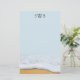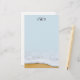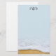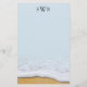 Papel de carta monograma com areia de praia e imagem de espuma marinha no fundo. O papel linen tem uma ligeira tonalidade azul ou muda o tipo de papel. Três iniciais pretas na parte superior podem ser removidas. Borda da imagem do oceano no fundo. Nenhuma imagem ao contrário.