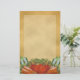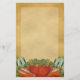 Papel de papelaria ligado a uma arte safena de legumes herbáceos com tomates, cenouras e milho num pergaminho falso. Clique em Personalizar para adicionar seu nome ou mensagem