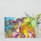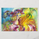 Pintura aquosa colorida, branca e vibrante, em cores amarelas brilhantes, roxas, azuis inspiradas no Carnaval de Veneza. Arlecchina é uma congênere feminina do Harlequin