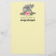 Papel de papelaria com uma adorável design de aquarela. Mãe e bebê do urso Koala. O bebê está andando nas costas da mamãe. Em pé em um galho de árvore. Um buquê de flores de hibisco abaixo. Fundo amarelo de banana.