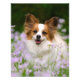 Um cão de White e Red Papillon sentado num prado cercado por Cuckooflower. O Papillon é uma raça de brinquedo muito inteligente, amistosa e inteligente. Uma fotografia adorável de cão tirada por Katho Menden, esta foto de animal numa poster de papel fotográfico é uma ideia especial encantadora para amantes de cães.