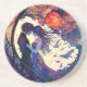 Um porta-copos de arenito com um desenho de vidro manchado de um casal e lua.