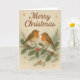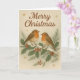Compartilhe a alegria da temporada com este elegante cartão de Natal. Dois robins descansam sobre uma cobertura sagrada de neve cercada de verde e bagas, capturando o charme de um dia de inverno tradicional.