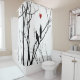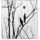 Dois pássaros mostrados em silhueta em ramos com um coração que flutua acima. Preto, branco e vermelho para um estilo minimalistic.